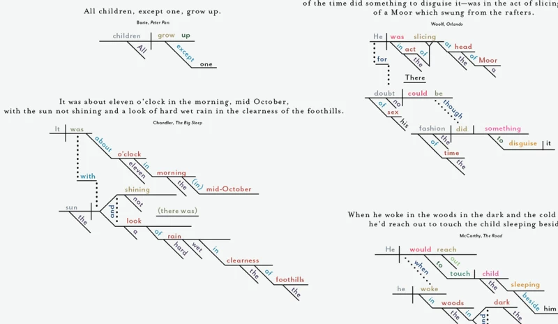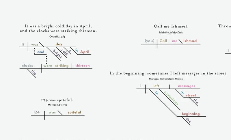也許你在學校花了一周時間製作這些圖表,但你班上同學的作品肯定不如你的好。 Pop Chart Lab 團隊製作了一系列資訊圖,涵蓋從經典遊戲到啤酒等各種主題,而他們最新的圖表則轉向了文學領域。 《著名小說開篇圖解論文》(A Diagrammatical Dissertation on Opening Lines of Notable Novels,這本身就是一個繞口令)由一系列簡單的里德-凱洛格句子圖組成,但將它們並排擺放卻別有一番風味。 《唐吉訶德》的開頭與托妮莫里森《寵兒》中看似簡單的「124 很惡毒」相比,顯得格外迂迴曲折。此外, 《萬有引力之虹》中的「一聲尖叫劃破長空」在這種形式下也顯得別具一格。