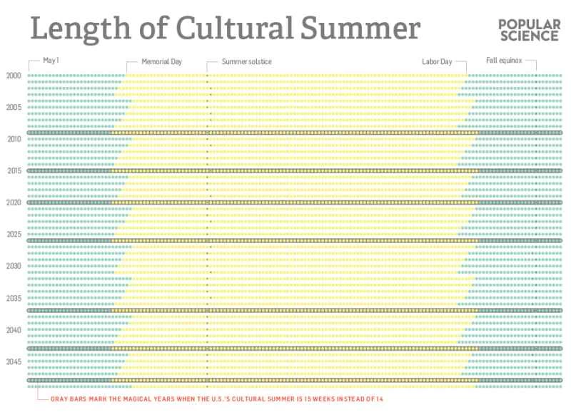 3. 有些年份,夏季文化活動會持續15週,而不是平常的14週,這真是神奇。這是日曆的奇妙之處:當五月的最後一個星期一是最早的,九月的第一個星期一是最晚的,那麼兩者之間就會多出一周的時間。這張圖表展示了這些夏季超長的年份。可惜的是,2014年的夏季只有14週。但明年和2020年都將多出7天,讓你盡情享受海灘、燒烤和日落美景。讓我們開始吧!