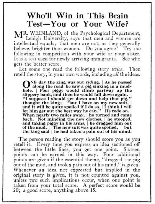 然而,我們無法否認心理學報告所顯示男女學生在智力測驗中的得分相同。我們也無法否認捐獻給科學研究的男女大腦重量和尺寸相同。我們的一些作者也承認這一點,認為男女雖然不同,但彼此平等。他們的智力和性情相得益彰。