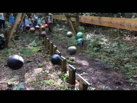 為了適應不同長度的繩子,同時保持保齡球離地面的高度大致相同,戶外設施下方的地面實際上是傾斜的。阿巴拉契亞州立大學教育學講師傑夫·古德曼與朋友們一起設計並建造了這個設施。 *