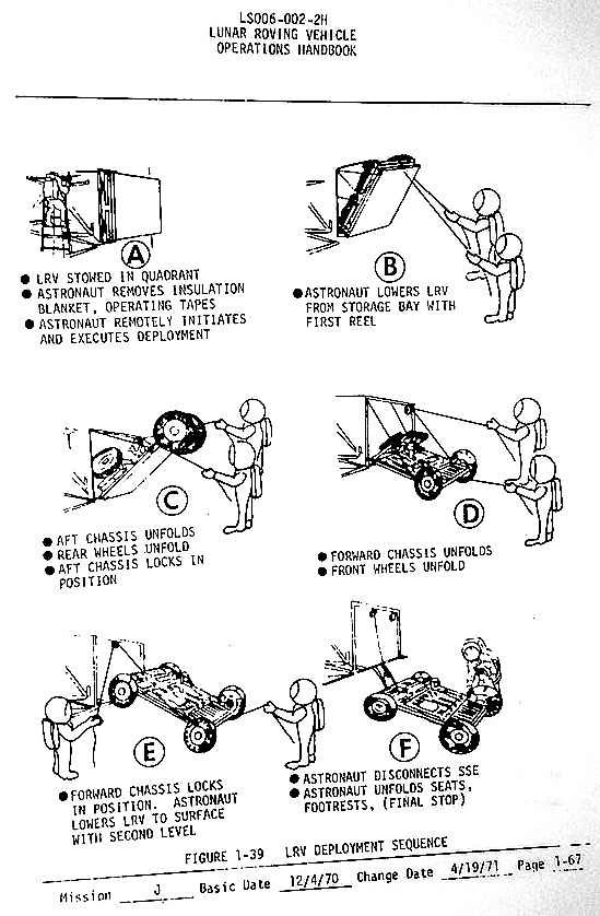 幸運的是,阿波羅登月艙內部有足夠的儲存空間來攜帶一輛折疊式月球車。月球車的車輪折疊起來,前後底盤(或框架)折疊到中間部分上方,可以緊密地裝入登月艙下降級的第一象限,這是航天器下部四個存儲單元之一。