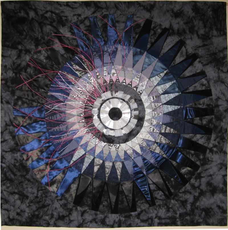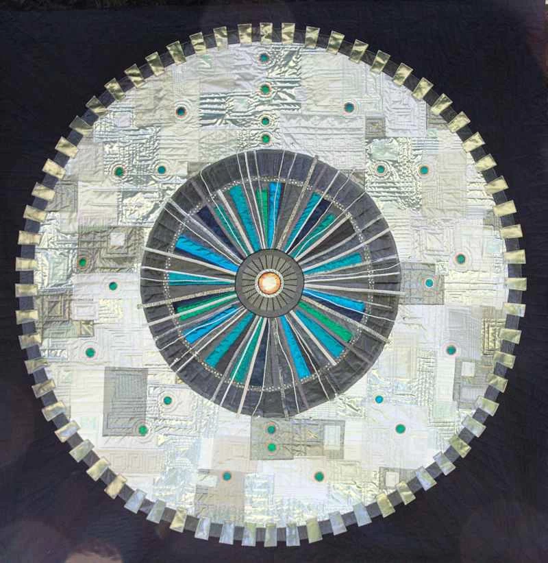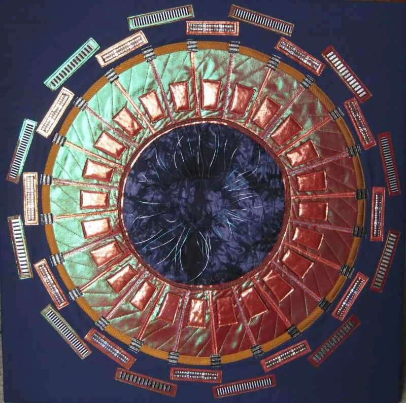 我的作品色彩深受歐洲核子研究中心(CERN)照片的影響,也大量運用了金屬布料。最近,我開始嘗試染色和絲網印刷,以獲得更微妙的效果。早期的作品是混合媒材:主要使用布料,但也融入了金屬絲、卡片、珠子、奇形怪狀的物件以及其他任何能達到理想效果的材料。大型拼布作品的結構較為傳統,由三層組成,但表面沒有任何黏貼物。我後來才意識到,我需要能夠把它們捲起來存放,因為它們太佔地方了!