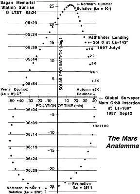 首先,他解釋說,要確定地方正午,也就是太陽穿過頭頂子午線的那一刻。這被稱為地方真太陽時。但是火星(和地球)的軌道是橢圓形的,一年中會不斷靠近或遠離太陽,因此隨著太陽在天空中高度的變化,地方正午的時間可能會有幾分鐘的誤差。為了更精確地確定時間,天文學家使用一種稱為「虛擬平均太陽」的東西,它會根據太陽的平均位置移動。這個位置——由一張叫做日行跡圖的圖表給出——就是地方平均太陽時。天文學家就是用這個時間來計時的。