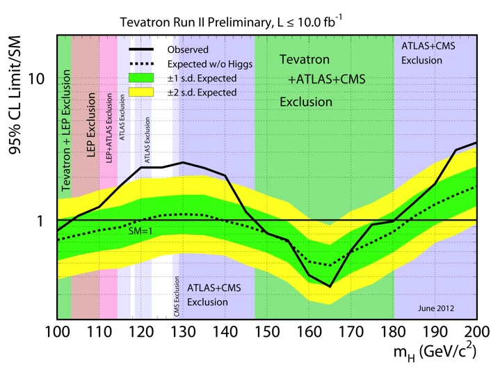 最新分析的證據表明,自2001年3月以來,Tevatron加速器進行了500兆次碰撞實驗,每次實驗都觀測到了這種假設的粒子。費米實驗室表示,觀測到的希格斯粒子訊號具有2.9σ的統計顯著性。這意味著該訊號是由統計波動引起的機率僅為1/550。也就是說,它很可能真的是希格斯粒子。