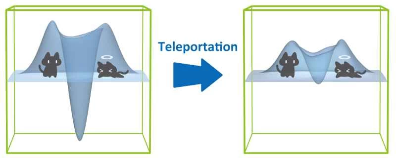 你選擇的糾纏方法取決於你想傳送的粒子類型。例如,如果你想傳送帶電原子,你會使用糾纏離子。對於光子,你會糾纏偏振光子。或者,它也可能是一種量子化的光子態,Noriyuki Lee 和他的同事去年就實現了這一點。後一種情況極為複雜,你需要傳送一小包同時處於兩種量子態的光子。 (這被稱為量子疊加,薛定諤的貓的例子最能說明這一點——一旦被放入一個理論上的盒子裡,它同時處於既死又活的狀態,直到你打開盒子檢查它,它才會變成其中一種狀態。)無論目標是什麼,你首先都必須糾纏一些粒子,使它們的命運交織在一起,這樣無論它們發生什麼,最終的結果都相同。