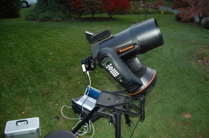我從小就是個天文望遠鏡愛好者──我大概有九台──所以在其他基本設備方面我算是佔了先機。我的其中一台望遠鏡非常適合天文攝影。它是一台來自 Celestron 的 8 吋口徑施密特-卡塞格林式望遠鏡,採用電腦控制。 (施密特-卡塞格林式望遠鏡結合了鏡片和透鏡,在緊湊的鏡筒內實現了較大的焦距和口徑。口徑越大,就能捕捉到更多的光線和更豐富的細節。)我可以校準電動赤道儀,使其平穩跟踪目標,而且我還選配了超穩固的支架,最大限度地減少了抖動。