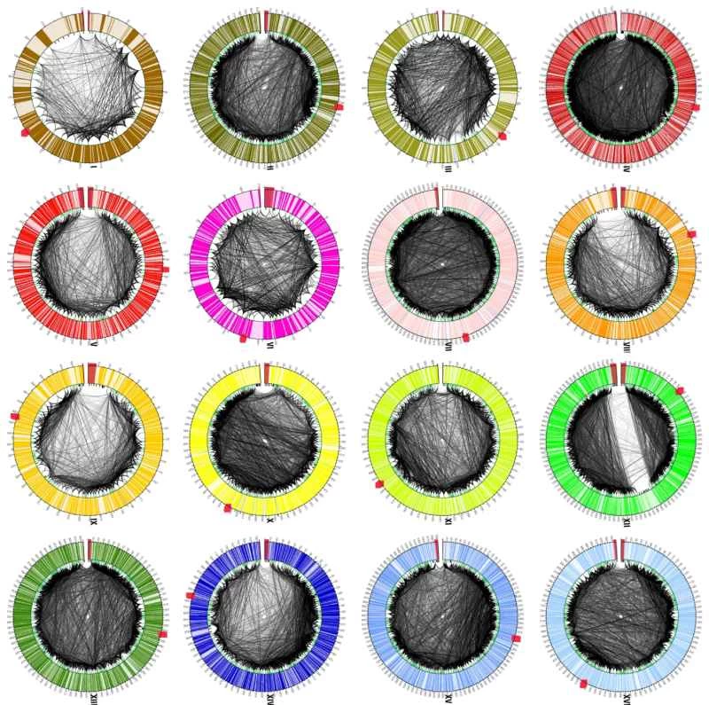 但事實證明,基因的包裝方式固然重要,染色體在細胞核中的位置也同樣重要。不妨這樣想:如果你有一台影印機,時間也比較充裕,你很可能會優先複印那些離你最近的文件,而不是把機器拖到辦公室另一頭去複印遠處的文件。染色體的排列方式也是如此——即使兩個基因在同一條「基因組」鏈上彼此靠近,如果它們最終在細胞核中相距甚遠,那也無關緊要。相反,如果兩條完全不同的染色體上的區域在細胞核中彼此相鄰,那就非常重要了——你會得到很多來自相鄰染色體區域的基因產物拷貝。該論文詳細介紹了研究人員如何利用一種相對較新的方法來創建這些相互作用的 DNA 文庫,從而觀察所有空間上相鄰的染色體位點,然後繪製和模擬釀酒酵母細胞核中的 16 條染色體如何相互作用。