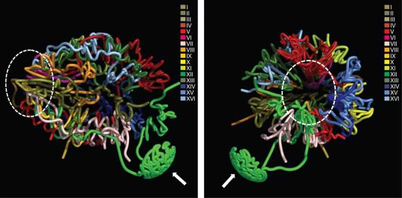 我與論文作者之一威廉·諾布爾(William Noble)就研究方法和結果進行了交流。這項研究最令人驚訝(也最令人擔憂)的結果之一是XII號染色體與其他染色體的差異。數據顯示,與其他染色體不同,XII號染色體有一大片區域幾乎不與其他結構相互作用。諾布爾說,他和負責分析的同事曾擔心數據中存在人為因素,導致XII號染色體看起來與其他染色體不同,但實際上並非如此。但進一步的分析揭示了答案:與其他所有染色體不同,XII號染色體的部分區域位於一個稱為核仁的大型結構中,核仁是核醣體RNA的合成場所。核仁就像一道屏障,阻止染色體的臂彼此靠近──這有點像沒有神探加傑特(Inspector Gadget)那樣的伸縮臂,就很難給相撲選手一個熊抱。
