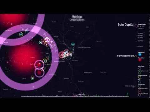 為了將這種(大多不可見的)政治行動形式可視化,藝術家兼研究員毛羅·馬蒂諾、社會學家薩沙·古德曼以及東北大學激光實驗室團隊的其他成員開發了一款軟體,用於下載、處理和地理編碼政治行動委員會(PAC)提交給聯邦選舉委員會的數千份文件中的數據。接下來,他們使用多種視覺化工具製作了一段動畫,展示了2012年全年競選捐款的地點和時間。他們重點關注了波士頓,因為他們居住在那裡,但該模型可以應用於任何地方。