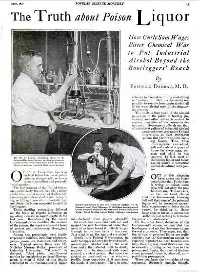 我們並非誇大其詞——由於私酒販子的疏忽大意,成千上萬人因飲用含有微量木醇的酒而喪命。儘管私酒市場無疑助長了社會腐敗,但我們認為它也對科學做出了貢獻,因為它孕育了一群意想不到的化學家和發明家。