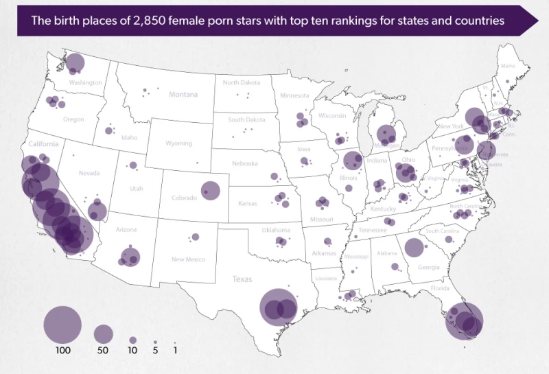 - 三分之一的色情女演員表示她們出生在加州。 (米爾沃德分析的演員中有3000名是男性,但他在部落格文章中更多地談到了女性。)