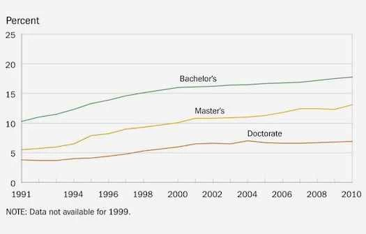 自 1991 年以來,獲得數學和科學學士和碩士學位的少數族裔人數緩慢但穩定成長。自 2004 年左右以來,少數族裔獲得博士學位的比例趨於穩定,並一直低於 8%。