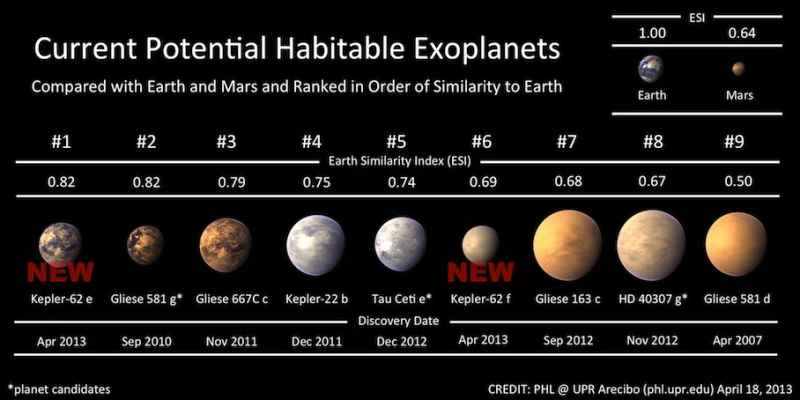 科學家最近在距離地球1200光年的克卜勒-62恆星系統中發現了兩顆系外行星。雖然它們比其他可能適合生命存在的系外行星(例如距離我們僅20光年的格利澤581g)要遠得多,但開普勒-62e和開普勒-62f卻是開普勒任務在其恆星“宜居帶”內探測到的最小的系外行星。而對於宜居性而言,行星的大小至關重要。特別是開普勒-62e,其半徑僅比地球大60%,這意味著如果它是一顆像地球一樣的岩質行星,其質量可能與地球相近。如果質量相近(意味著引力相近)且擁有大氣層,開普勒-62e就可能存在我們所知的生命。事實上,開普勒-62e目前在潛在宜居系外行星排行榜上名列榜首。