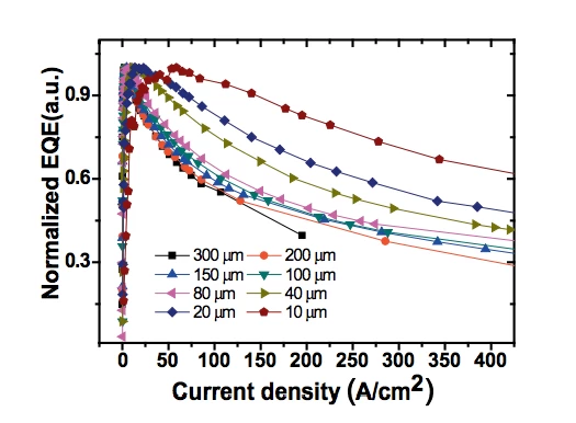 在低功率應用場景下,例如手機,這種發光方式效果很好。但當電流提升到足以照亮整個房間的水平時,氮化物基LED的光子產生速率就會下降。加州大學聖塔芭芭拉分校節能材料中心的研究表明,這是因為電子之間會發生碰撞,並將能量以熱的形式而非光的形式散失。