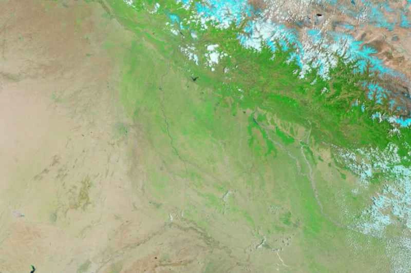 本月,印度北部和尼泊爾遭遇暴雨襲擊,引發毀滅性洪水和山體滑坡,正如美國宇航局地球觀測站提供的這些假彩色衛星圖像所示。如圖所示,該地區的主要河流水位已遠超正常範圍,喜馬拉雅山脈的冰川(右側淺藍色區域)也顯著增加。