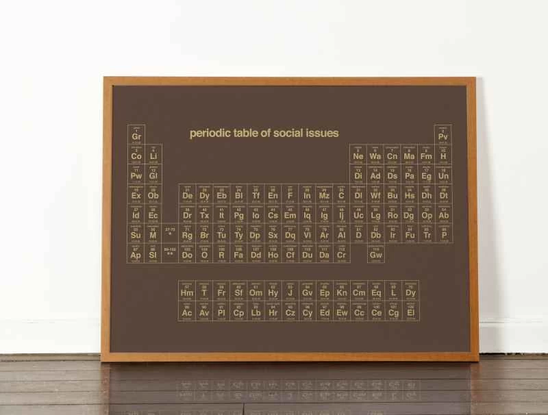 社會問題週期表旨在模仿真正的元素週期表,後者是按照元素的原子序數和化學性質排列的。很難說這兩張表格究竟有多吻合。貪婪和貧窮是我們最普遍的社會問題嗎?腐敗、權力、奢侈和冷漠比其他罪惡更令人反感嗎?法西斯主義比性別歧視更嚴重嗎? (值得注意的是,全球暖化的原子序為114,是該表中「最重」的元素。)