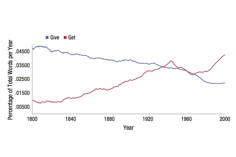 格林菲爾德利用Google圖書Ngram Viewer分析了1800年至2000年間美國和英國出版的一百多萬本書的詞頻數據,發現我們的語言逐漸轉向關注個人主義和物質利益。我們現在更多地使用「獲得」和「選擇」這類關注個人的詞語,而不是「給予」和「有義務」這類關注群體的詞語。