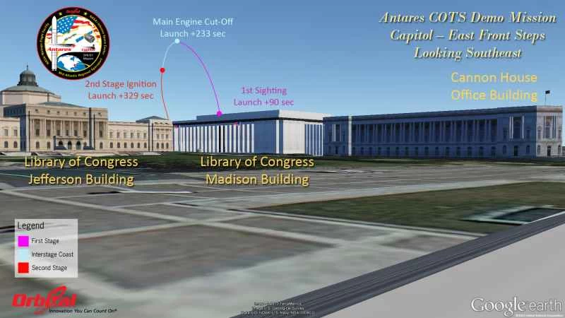 這裡提供了一系列圖表,展示了安塔瑞斯火箭的飛行軌跡,以及從地面或摩天大樓的角度,在包括安納波利斯、美國國會大廈、林肯紀念堂、國家航空航天博物館、新澤西州大西洋城、紐約市等各種熱門地點,發射兩級火箭時應該看到的景象。