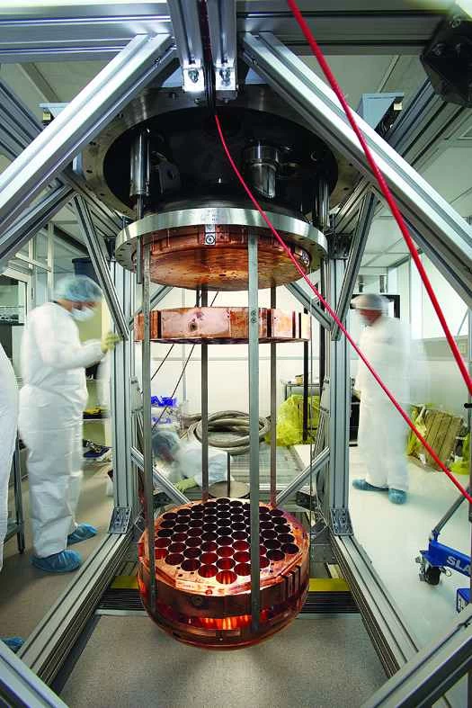 在這個六月的午後,我已連續幾個小時透過潔淨室的窗戶觀察著四位物理學家。他們穿著相同的白色杜邦特衛強防護服,戴著乳膠手套、藍色鞋套、醫用口罩和護目鏡,正準備連接探測器的兩個主要部件。內部低溫恆溫器是空心圓柱體,大小與垃圾桶相仿,大家都簡稱它為「桶子」。此刻,它位於地面下一個覆蓋著格柵的坑中。坑上方框架上懸掛著圓頂,它相當於桶子的蓋子;而從圓頂上垂下的,則是一個被稱為骨架的複雜組件。他們的想法是小心翼翼地將桶套在骨架上,像俄羅斯娃娃一樣層層嵌套,直到與圓頂蓋完美連接,形成嚴密的密封。