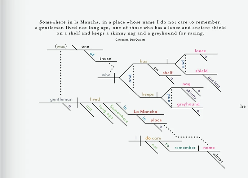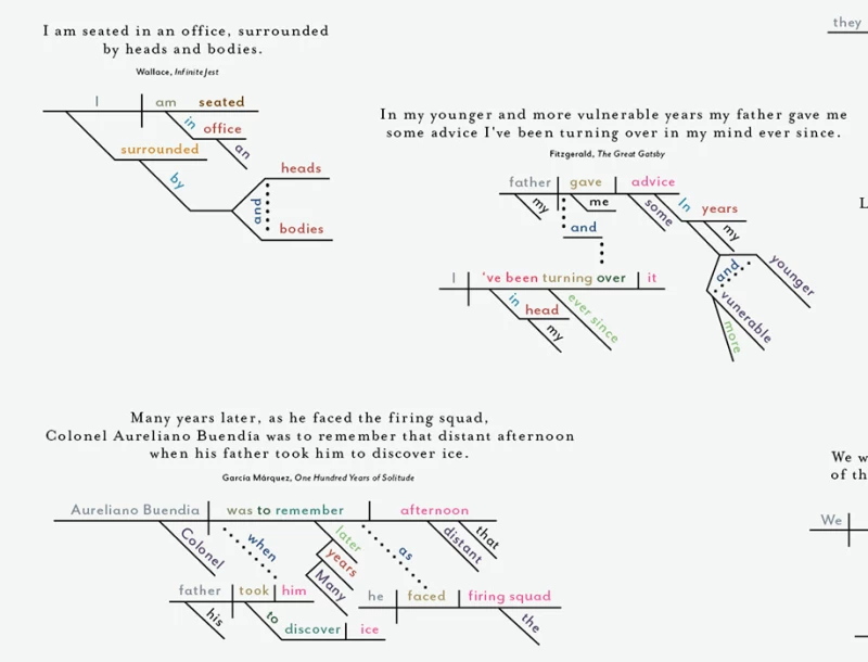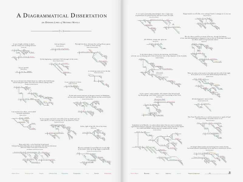 也許你在學校花了一周時間製作這些圖表,但你班上同學的作品肯定不如你的好。 Pop Chart Lab 團隊製作了一系列資訊圖,涵蓋從經典遊戲到啤酒等各種主題,而他們最新的圖表則轉向了文學領域。 《著名小說開篇圖解論文》(A Diagrammatical Dissertation on Opening Lines of Notable Novels,這本身就是一個繞口令)由一系列簡單的里德-凱洛格句子圖組成,但將它們並排擺放卻別有一番風味。 《唐吉訶德》的開頭與托妮莫里森《寵兒》中看似簡單的「124 很惡毒」相比,顯得格外迂迴曲折。此外, 《萬有引力之虹》中的「一聲尖叫劃破長空」在這種形式下也顯得別具一格。
