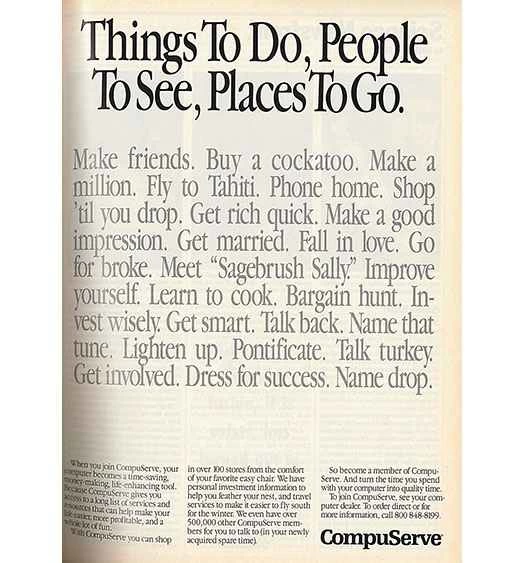 在 AOL 出現之前,CompuServe 為人們提供了一個通往早期網路的入口。這則廣告試圖解釋你可以在網路上做的所有酷炫的事情——包括在 100 多家商店購物!