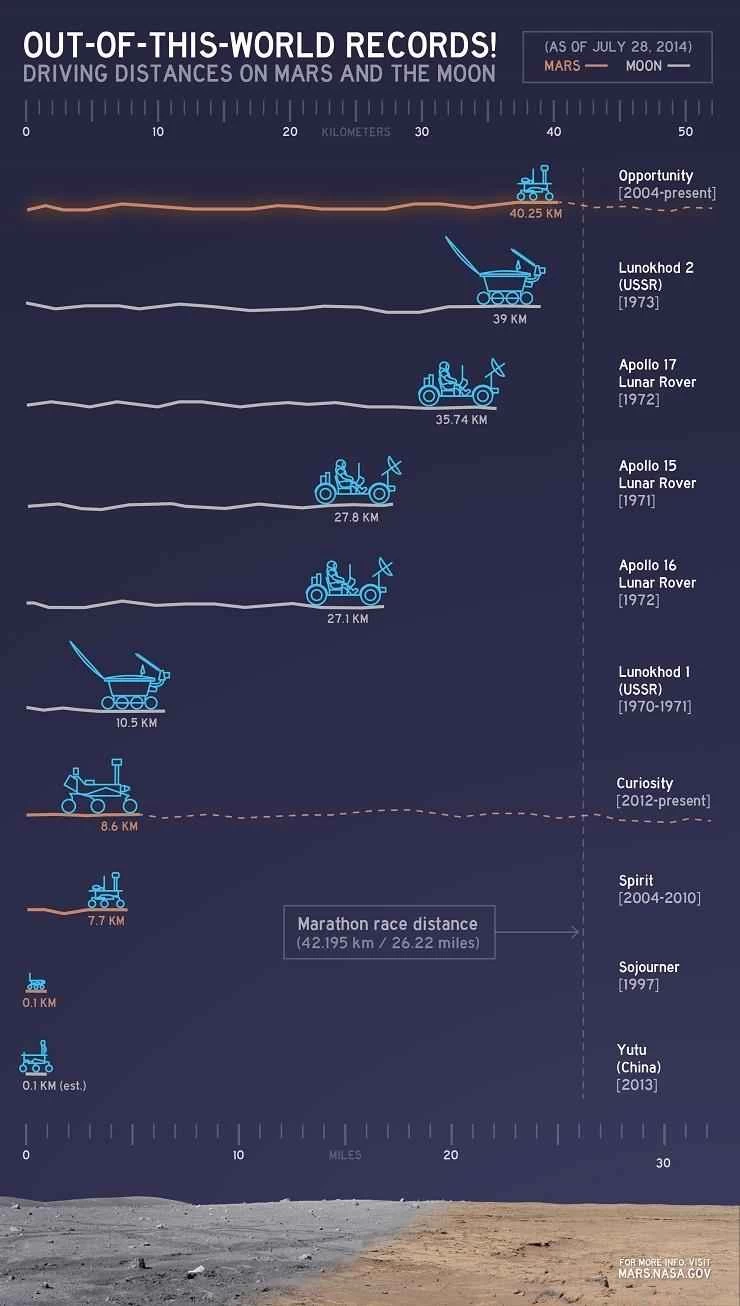 事實證明,月球車的快速研發非常值得。在前三次登月任務——阿波羅11號、阿波羅12號和阿波羅14號——中,太空人總共行駛了4.4英里。有了月球車,阿波羅15號的行駛距離是之前的3倍多,總共行駛了17英哩。阿波羅16號的行駛距離略少,只有16.8英里。最後一次登月任務——阿波羅17號——充分發揮了月球車的功能。 1972年12月,尤金·塞爾南和傑克·施密特駕駛月球車從著陸點出發行駛了4.5英里,比以往任何太空人行駛的距離都遠,在月球表面總共行駛了22.2英里,最高速度達到了約11.5英里/小時。
