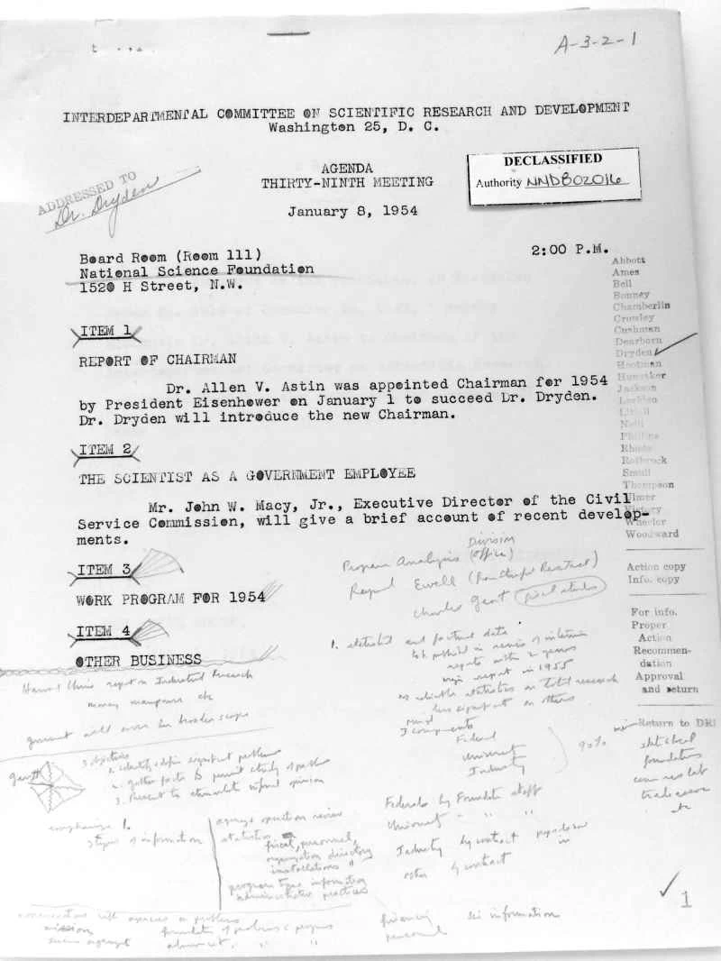 如果你曾在開會時塗鴉,你並不孤單,儘管你的塗鴉可能不會被保存下來,造福國家。位於馬裡蘭州的國家檔案館和記錄管理局(NARA)致力於保存構成我們共同歷史的文獻,同時允許任何人查閱幾乎任何他們想要的內容。 NARA的規定非常嚴格,你甚至不能把筆或水瓶帶進閱覽室。當你看到檔案館裡一些被費盡心思保存下來的東西時,這些規定似乎就顯得有些奇怪了。例如,跨部門科學研究與發展委員會第三十九次會議的議程。顯然,一位與會者花在記筆記和在紙上塗鴉的時間幾乎一樣多。