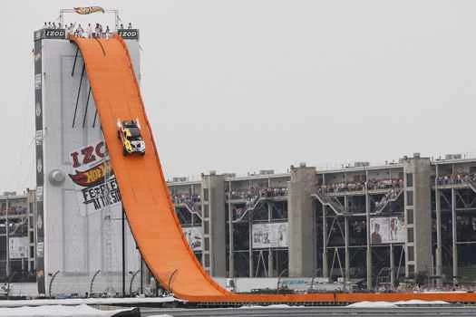 這條亮橘色的合板軌道設計得就像你小時候臥室裡的風火輪玩具一樣,從印第安納波利斯500賽道內場一扇100英尺高的門上以45度角懸掛下來。軌道從那裡開始平坦延伸近90英尺,然後起跳坡道向上傾斜10度,將車輛彈射出去。這些角度的設定部分取決於特技表演的長度、卡車的類型,並確保在印第安納波利斯賽道的範圍內,福斯特在完成跳躍後有275英尺的距離煞車停下,避免撞到護牆。 (實際上,煞車距離是250英尺。在創紀錄的那天,他衝進了沙坑。)