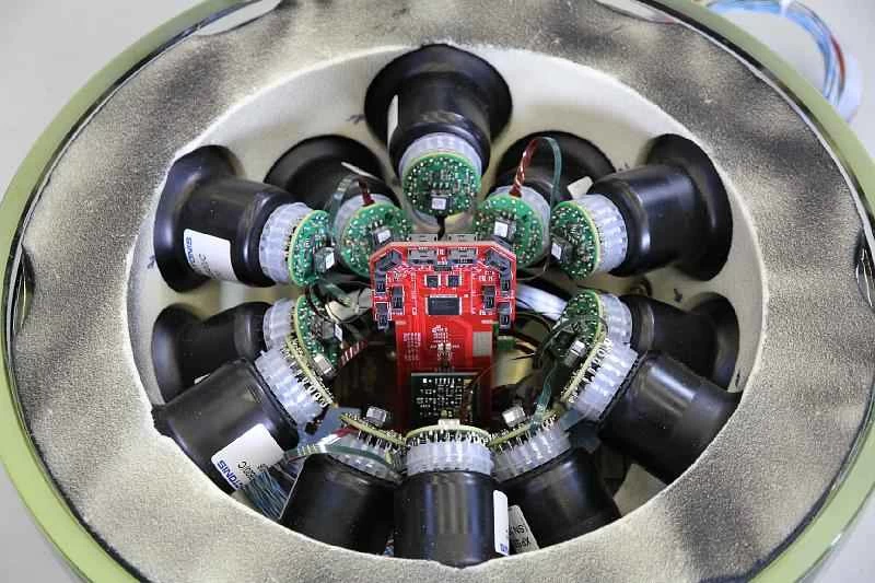 不出所料,實現這些光觀測的技術相當複雜。偵測這些藍色閃光的光學感測器稱為光電倍增管,每個光電倍增管都能記錄單一光子產生的電訊號。在先前的探測器中,包括IceCube以及Antares和AMANDA等前身探測器,光電倍增管都是一維的,並且安裝在繩索上。 KM3NeT將把它們安裝在被稱為數位光學模組的球形壓力容器中,然後將這些模組安裝到水下塔架上。
