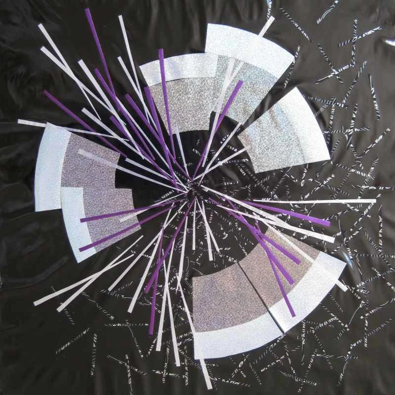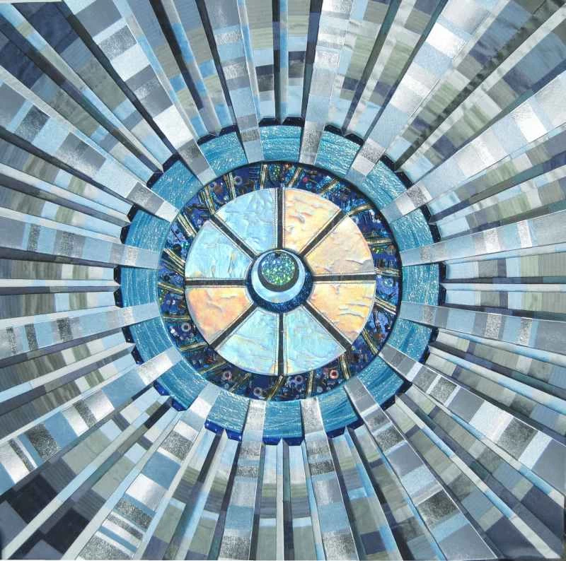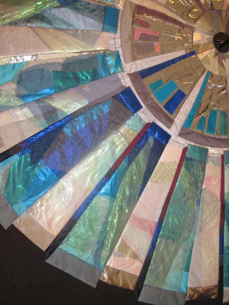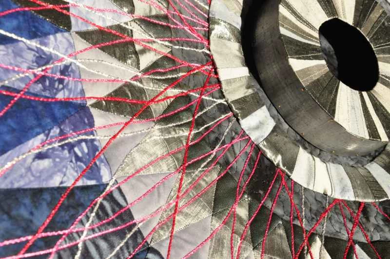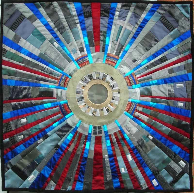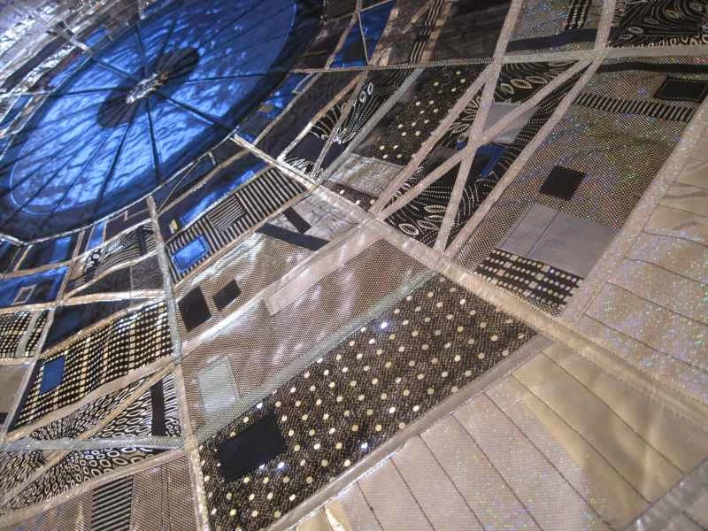 我的作品色彩深受歐洲核子研究中心(CERN)照片的影響,也大量運用了金屬布料。最近,我開始嘗試染色和絲網印刷,以獲得更微妙的效果。早期的作品是混合媒材:主要使用布料,但也融入了金屬絲、卡片、珠子、奇形怪狀的物件以及其他任何能達到理想效果的材料。大型拼布作品的結構較為傳統,由三層組成,但表面沒有任何黏貼物。我後來才意識到,我需要能夠把它們捲起來存放,因為它們太佔地方了!