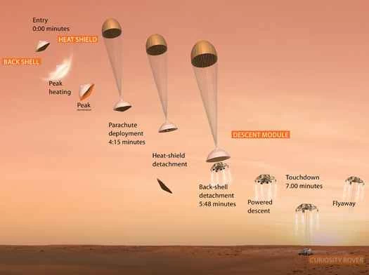 當火星科學實驗室(MSL)減速至900英里/小時時,它將展開一個51英尺長的尼龍和聚酯纖維降落傘。在一分半鐘內,探測器將減速至180英里/小時。當MSL的雷達顯示其位於火星表面上方5英里處時,隔熱罩將脫落,高清相機——火星下降成像儀(MDI)將開始拍攝視頻,科學家隨後將利用這些視頻研究著陸點及其周圍區域。隔熱罩脫落約80秒後,MSL的後殼將脫落,降落傘也將隨之脫落,屆時只剩下下降艙和「好奇號」火星車繼續降落。