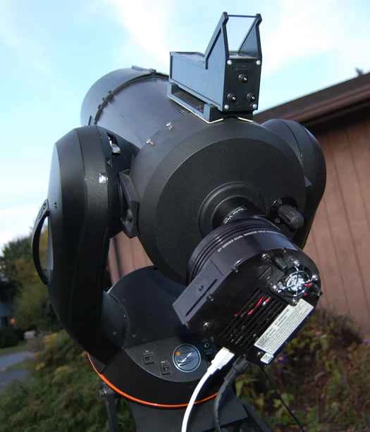 我從小就是個天文望遠鏡愛好者──我大概有九台──所以在其他基本設備方面我算是佔了先機。我的其中一台望遠鏡非常適合天文攝影。它是一台來自 Celestron 的 8 吋口徑施密特-卡塞格林式望遠鏡,採用電腦控制。 (施密特-卡塞格林式望遠鏡結合了鏡片和透鏡,在緊湊的鏡筒內實現了較大的焦距和口徑。口徑越大,就能捕捉到更多的光線和更豐富的細節。)我可以校準電動赤道儀,使其平穩跟踪目標,而且我還選配了超穩固的支架,最大限度地減少了抖動。