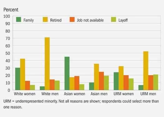 在自稱失業的白人男性工程師和科學家(約佔4%),71%的人表示失業原因是退休。這一比例遠高於下一組:失業的少數族裔男性科學家,其中52%的人表示失業原因是退休。