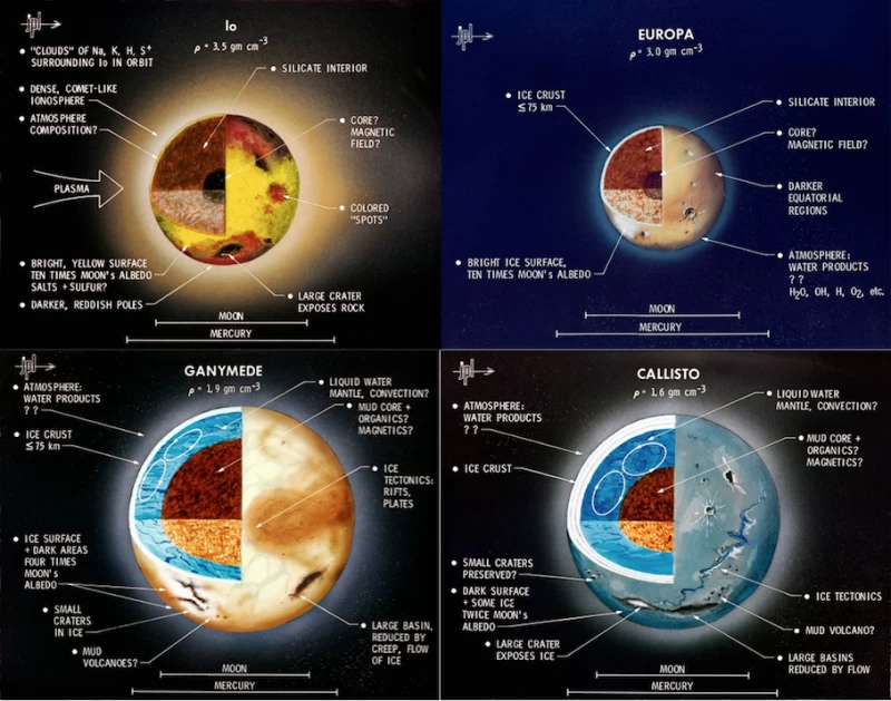 隨著2001年的臨近,伽利略號探測器在旅行者號探測器成功的基礎上,繼續探測木星系統。它揭示了旅行者號觀測到的複雜地質細節,並基於木星衛星對木星強磁場的反應,提供了新的見解。新的研究結果表明,木星衛星的冰層很薄,厚度在3到30公里之間,冰層下存在著一個鹹水海洋。在木星表面下約100公里的海底,液態水與岩石直接接觸,這種情況與地球海洋驚人地相似。