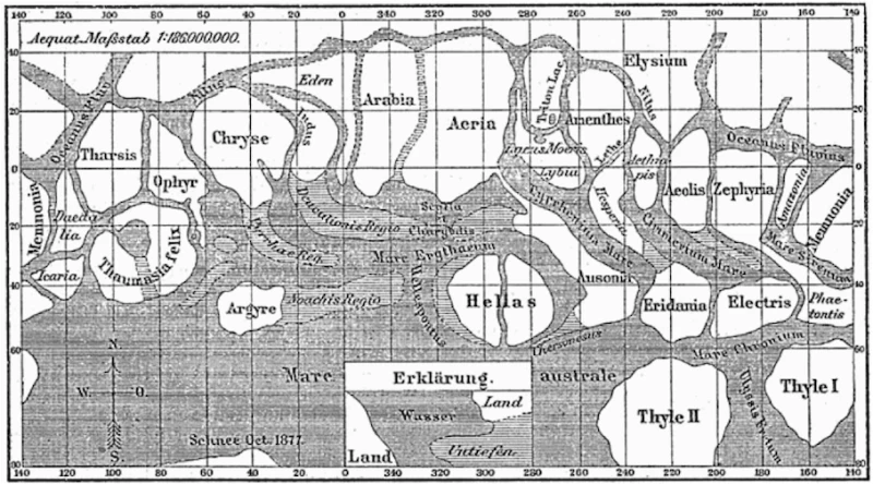 《世界大戰》、《異星戰場》 、《小綠人》……這些熟悉的詞彙都源自於20世紀科幻小說的黃金時代。自從1877年喬瓦尼·斯基亞帕雷利繪製的第一張火星地圖上出現“運河”以來,火星激發了人們對高度發達的外星文明的無限遐想。此後數十年間,珀西瓦爾·洛厄爾證實了火星上存在“運河”,並將這些新地貌渲染成外星人的偉大傑作,引發了轟動。科學家隨後就火星上是否存在智慧生命展開了長達40年的嚴肅辯論,直到洛威爾於1916年去世。