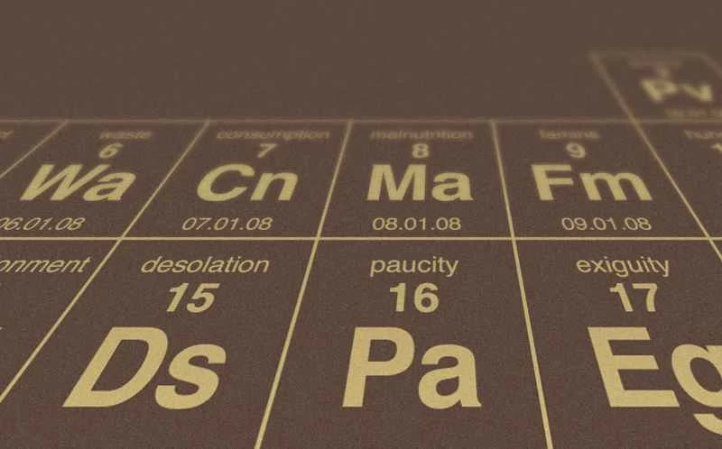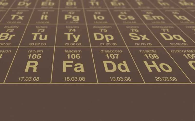 社會問題週期表旨在模仿真正的元素週期表,後者是按照元素的原子序數和化學性質排列的。很難說這兩張表格究竟有多吻合。貪婪和貧窮是我們最普遍的社會問題嗎?腐敗、權力、奢侈和冷漠比其他罪惡更令人反感嗎?法西斯主義比性別歧視更嚴重嗎? (值得注意的是,全球暖化的原子序為114,是該表中「最重」的元素。)