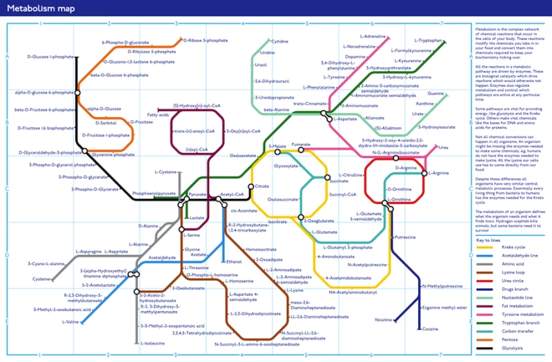 這裡,「地鐵」線路代表代謝途徑,標註在右下角的方框中。這些途徑描繪了一種化學物質如何在一系列酶的催化下轉化為另一種化學物質。這並非代謝過程中所有化學反應的完整圖示,但有助於理解其原理。
