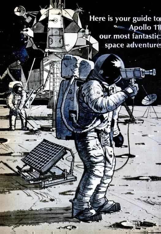 「先前太空人們一直看不到的月球表面,如今從舷窗底部緩緩映入眼簾。他們看到的是一片平坦且相對沒有隕石坑的月壤……任務的高潮終於到來——長達兩小時四十分鐘的精彩‘月球漫步’。阿姆斯特朗指揮官將從前艙門的舷梯下來,成為第一個踏上月球的奧爾德月。他幾乎做的第一件事給他的第一件事。