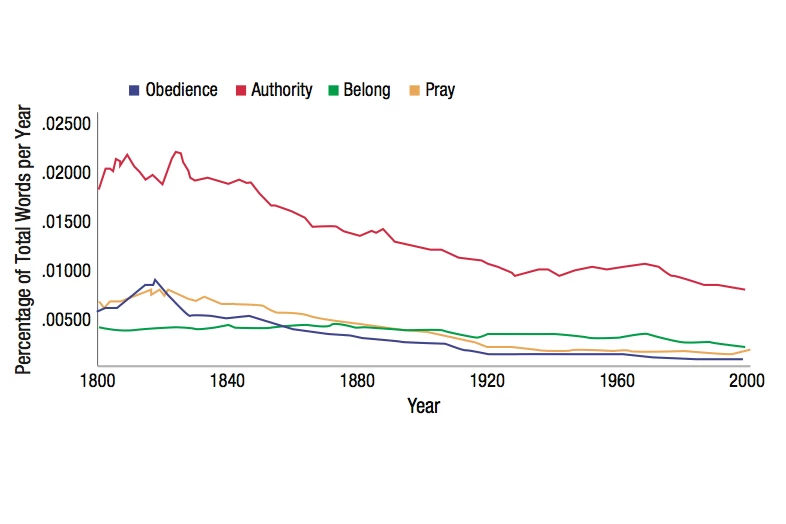 然而,其他跡象表明,如今我們大多只顧自身利益,或許正在背離更傳統的社會結構。自1800年以來,「自我」、「獨特」和「個體」等詞語的使用頻率相對增加,而「權威」、「服從」、「歸屬」和「祈禱」等詞語的使用頻率則呈下降趨勢。