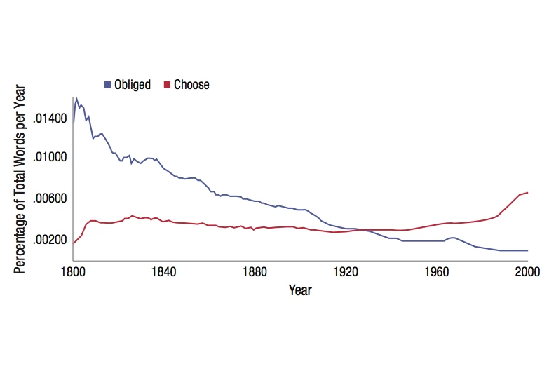 格林菲爾德想要尋找的不僅僅是俚語或用詞偏好上的簡單變化,她還研究了同義詞和相關詞彙的數據,以確定它們是否經歷了相同的用法變化。例如,對於「choose」(選擇)和「obliged」(有義務的),她也研究了「decision」(決定)和「duty」(職責)的用法。