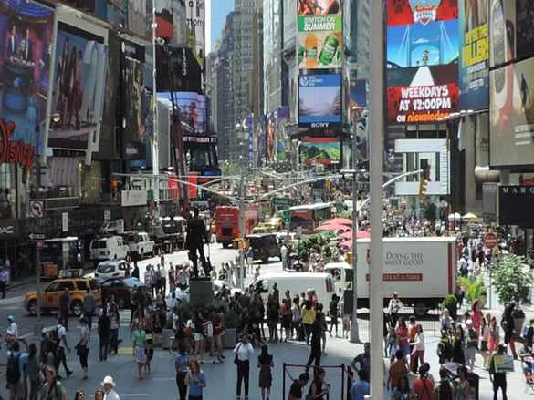 對比時代廣場上的人和在陰涼處散步的人(左下角)有多熱: