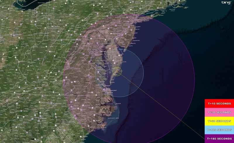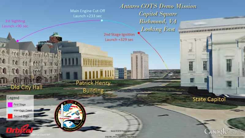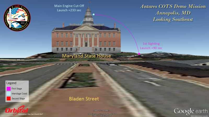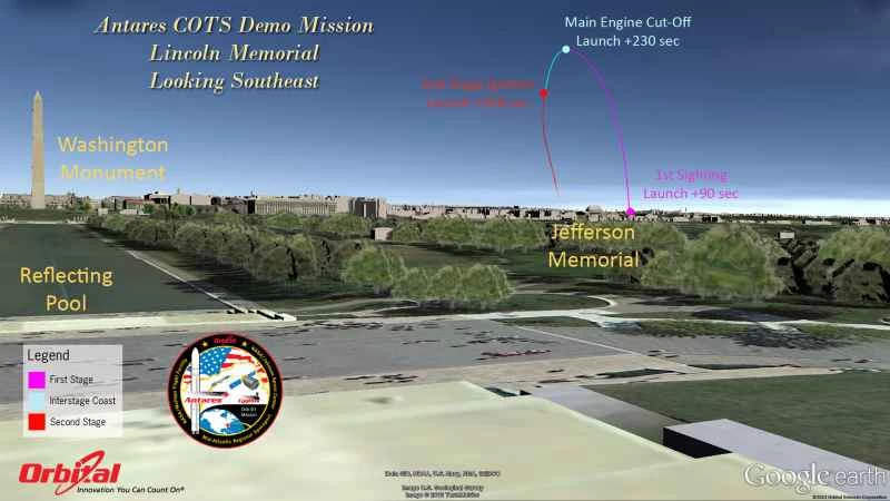 這裡提供了一系列圖表,展示了安塔瑞斯火箭的飛行軌跡,以及從地面或摩天大樓的角度,在包括安納波利斯、美國國會大廈、林肯紀念堂、國家航空航天博物館、新澤西州大西洋城、紐約市等各種熱門地點,發射兩級火箭時應該看到的景象。